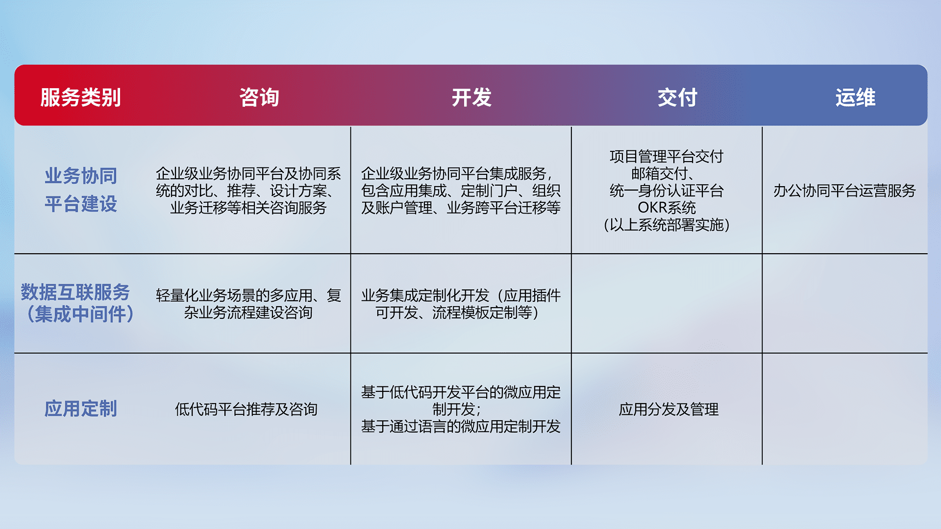 针对钉钉、、企微、、、IDaas等平台级产品提供产品的规划、、方案、、交付、、、定制化开发等服务,,实现如统一协同办公、、、、智能客户服务、、混合会议管理、、智能数据查询、、、等业务场景,,,实现数字化转型。。。