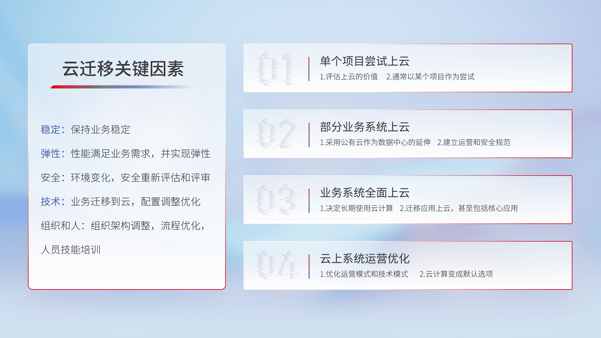 结合实际业务,,,从规划设计、、云平台选型、、、、云原生改造、、数据迁移、、集成交付,,迁移全过程为客户识别最佳上云路径,,,,做好风险识别管理,,设计网络架构、、身份权限、、、安全审计合规、、操作审计、、、日志审计、、、监控告警策略、、多站点容灾设计等,,,,对云上基础设施进行整体规划,,,,提升IT治理水平,,,,以满足弹性、、高可用、、、高性能的需求。。